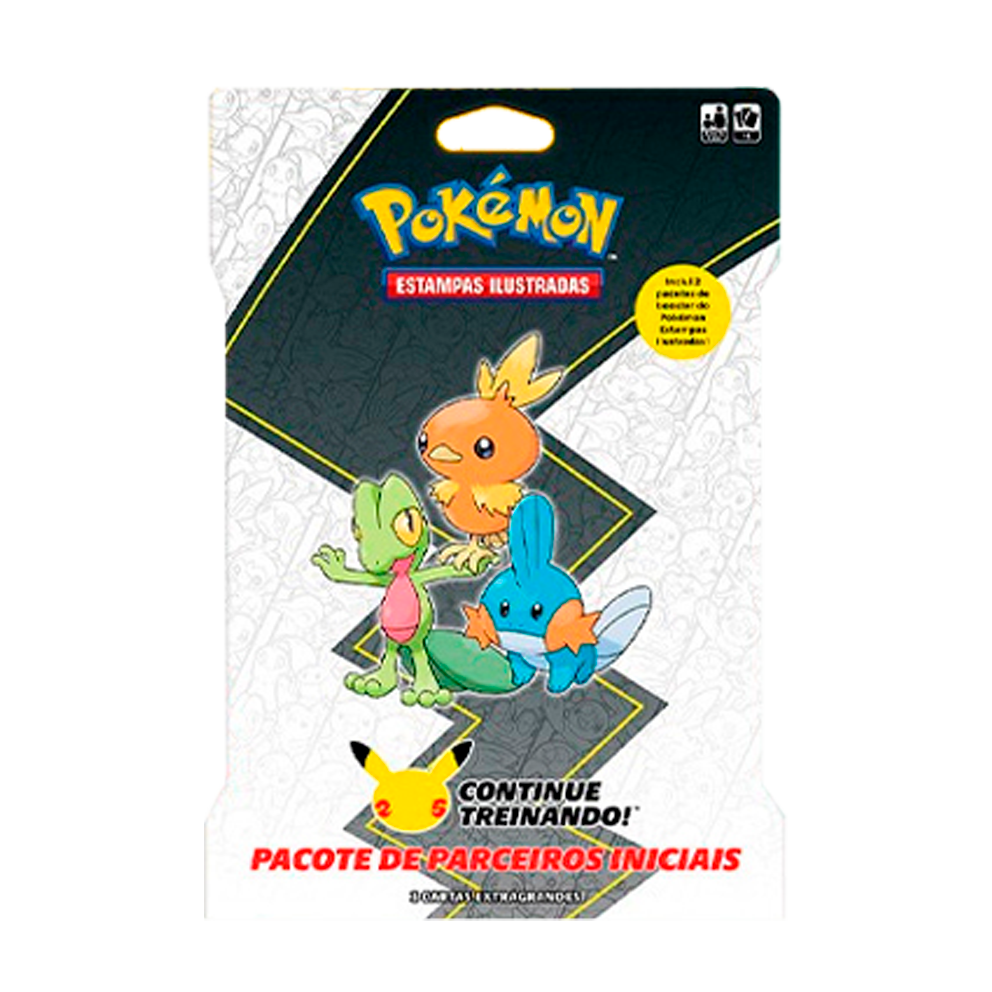Este pacote de parceiros iniciais conta com 3 cartas extragrande incríveis dos iniciais de Hoenn para a sua coleção, além de 2 pacotes de booster normais do Pokémon Estampas Ilustradas!