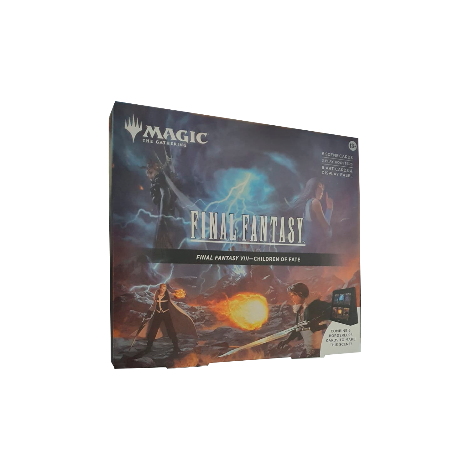 Magic: The Gathering – FINAL FANTASY Scene Box: Children of Fate contém 6 cartas scene sem borda em foil tradicional, 6 cartas scene somente com arte, 3 Play Boosters e um suporte de papel para exposição.