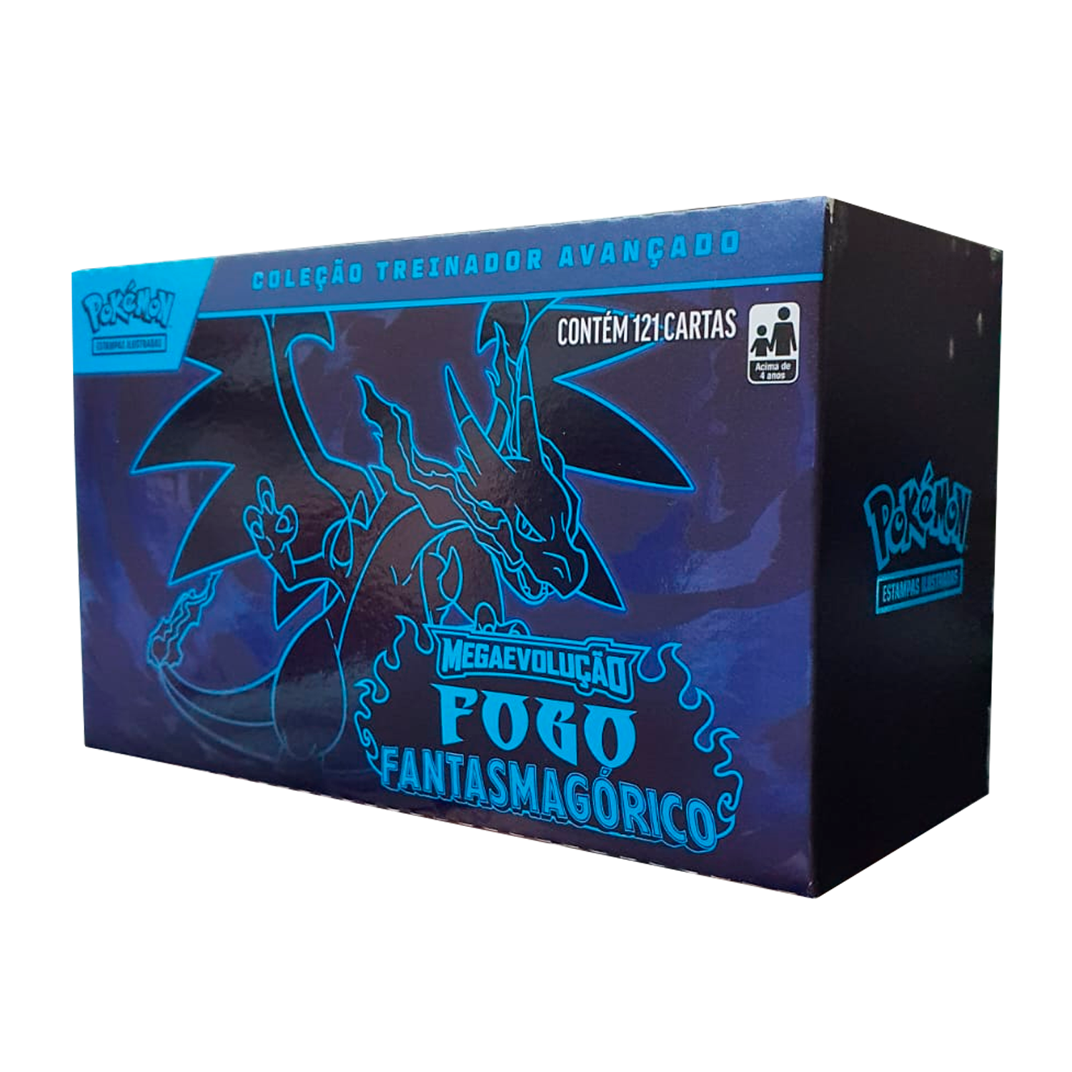 Chamas Azuis cauterizantes rasgam um campo escuro de batalha enquanto Mega Charizard X ex observa seus oponentes das alturas!