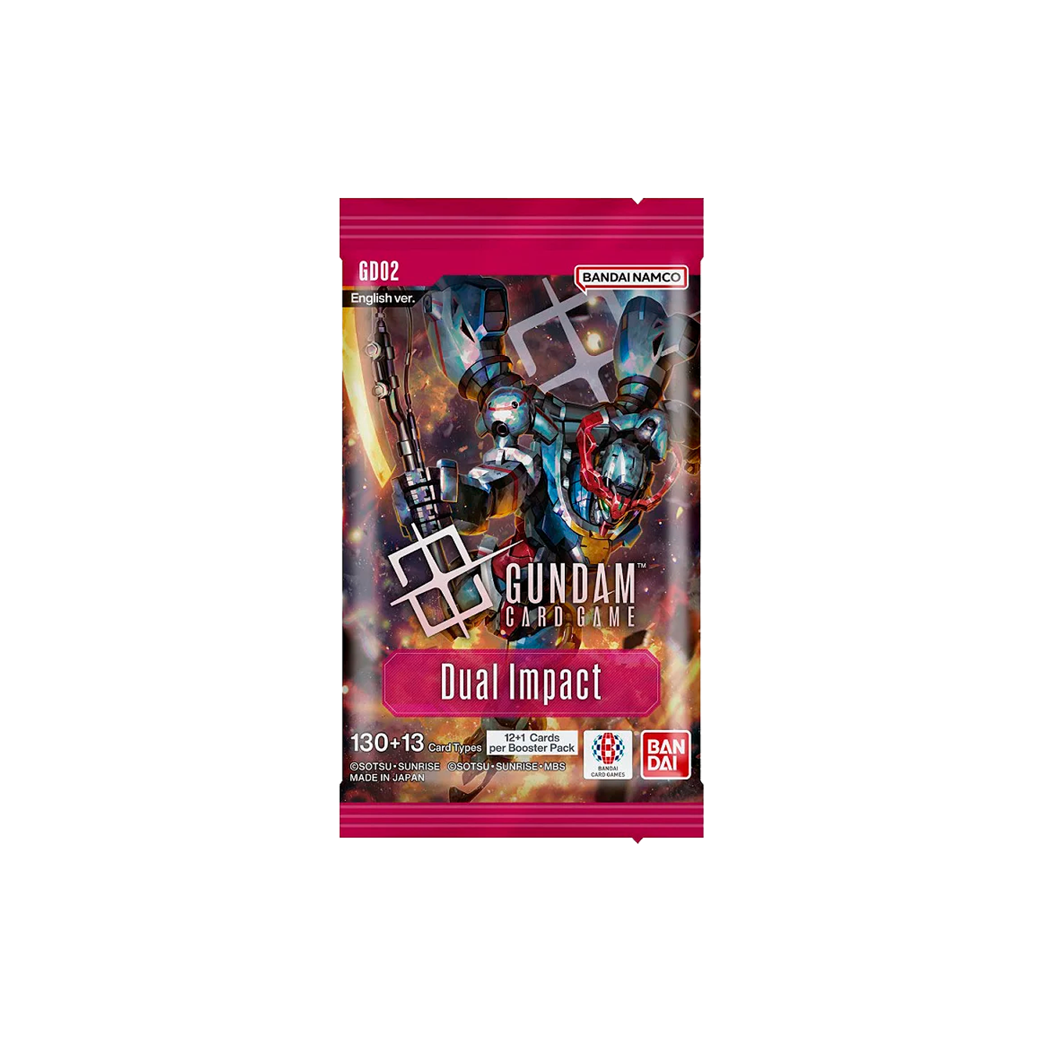 Os pacotes de booster do Gundam Card Game "Dual Impact" [GD02], contêm uma variedade de cartas para expandir as opções de construção de decks. Esses pacotes podem inclur uma seleção de cartas comuns, raras e até lendárias raras, além de cartas de ficha (token) ou de recurso.
