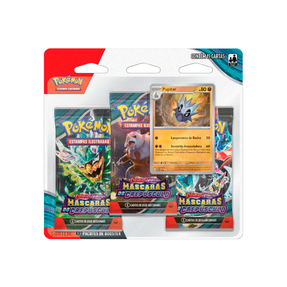 Cada blister triplo Pokémon Escarlate e Violeta - Máscaras do Crepúsculo contém 19 unidades de cartas no formato 63mm x 88mm